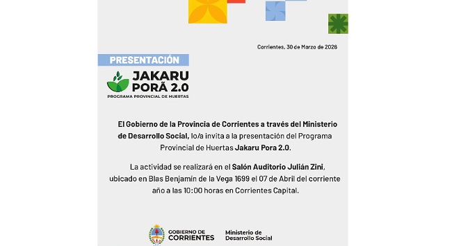 06/04/2026 | El Gobierno Provincial, a través de los Ministerio de Desarrollo Social y de Producción, invita a la presentación del Programa de “Huertas Jakaru Porä 2.0”. La misma será el martes 7 de abril a las 10, en el Auditorio Julián Zini, ubicado en Blas Benjamín de la Vega 1699 de esta Capital.