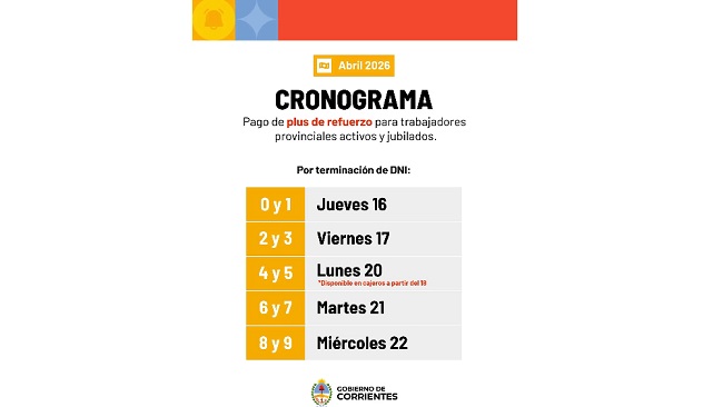 15/04/2026 | Entre este jueves 16 y el miércoles 22, los agentes de la administración pública provincial, activos, jubilados y pensionados, percibirán el Plus de Refuerzo de $100 mil por beneficiario, correspondiente a abril. Este beneficio forma parte, junto con el Plus Unificado (Adicional Remunerativo Mensual) y el sueldo, del Ingreso Salarial Mensual que paga el Gobierno de Corrientes.